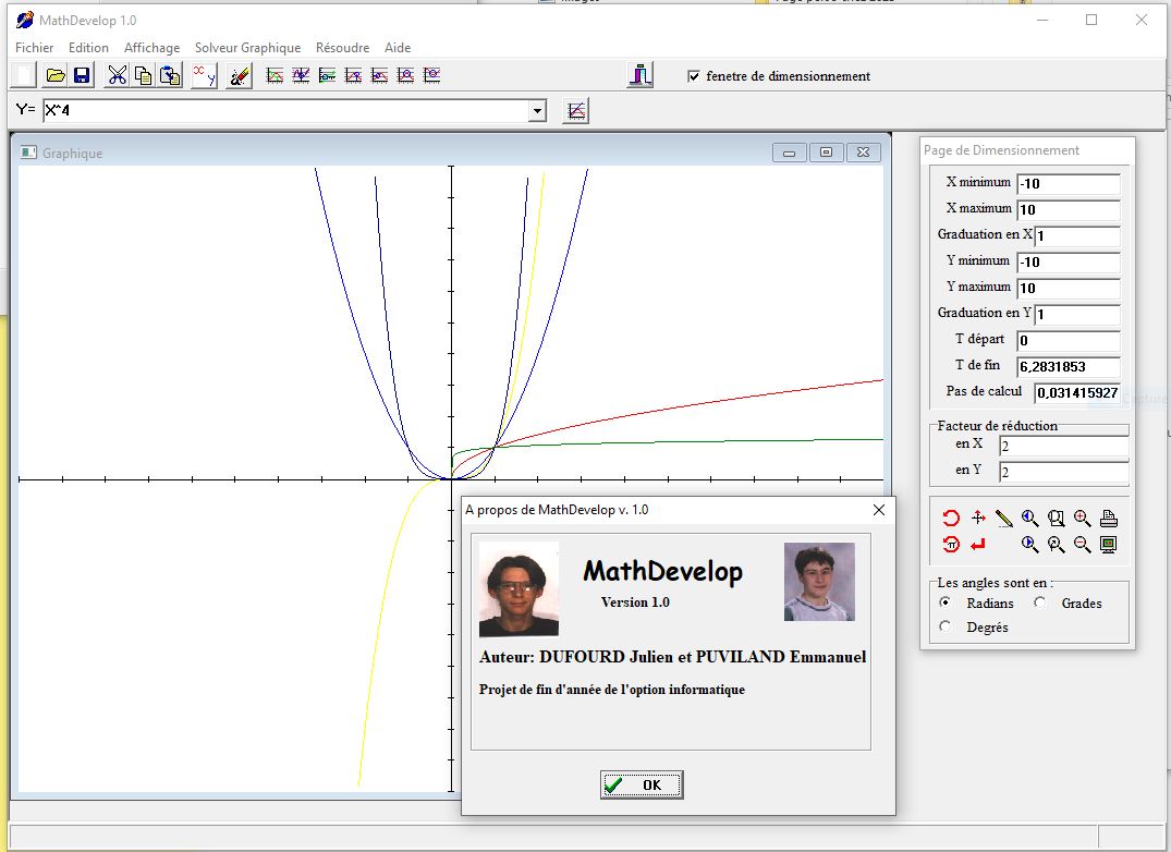 Concevoir et développer une application de Janvier à Mai 1998 à raison de deux heures par semaine. Ce développement sera transversal par le lien avec une matière enseignée en classe de Terminale. Le choix d'un logiciel de Mathématique étant fixé, l'outil de développement sera DELPHI 3.0 et les fonctions du logiciel correspondent au programme de Terminale S. |