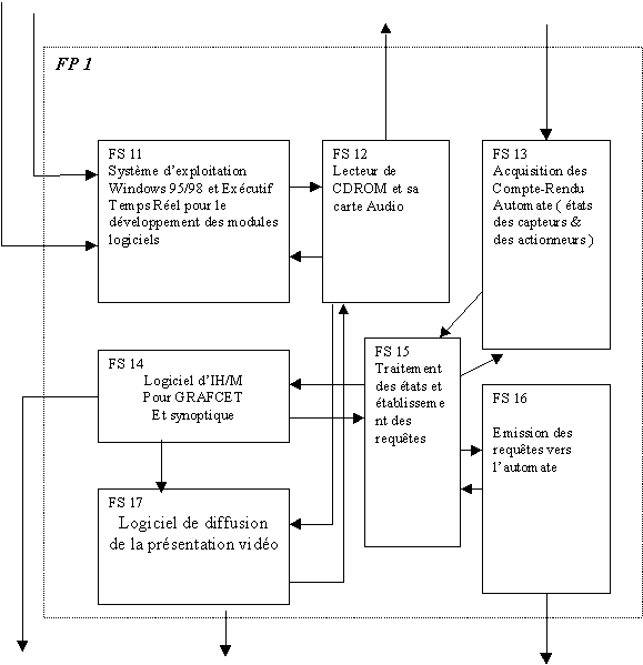 Réf. Fonction Description Contraintes FS 11 S.E. Win98 + Exécutif TR Permettre le développement du logiciel et assuré le pilotage des périphériques Vitesse dexécution des programmes suffisante avec respect des contraintes TIC FS 12