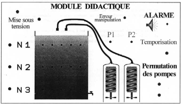 Ce synoptique déjà existant comporte un interrupteur de Mise sous Tension et trois Boutons poussoirs de simulation des niveaux de cuve ( N1, N2 & N3 ).