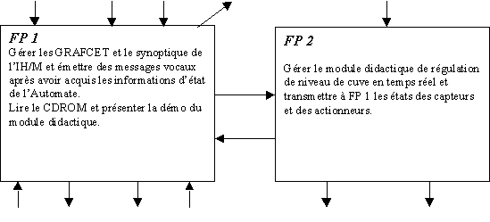 Le fonctionnement initialement prévu sera respecté et accompagné par lanimation à lécran SVGA dune évolution séquentielle par jeton sur les GRAFCET " point de vue fonctionnel " et " point de vue partie opérative ". Ces évolutions Temps Réel constituerons ainsi une Interface Homme/Machine bien utile aux élèves pour la compréhension du fonctionnement du système " Régulation de niveau de cuve ".