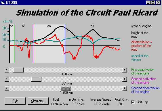 Les dénivelés du circuit ont étés multipliés par un facteur 10. Vous pouvez télécharger l'exécutable de cette simulation en cliquant sur ce lien : ETQ98RAR.exe |